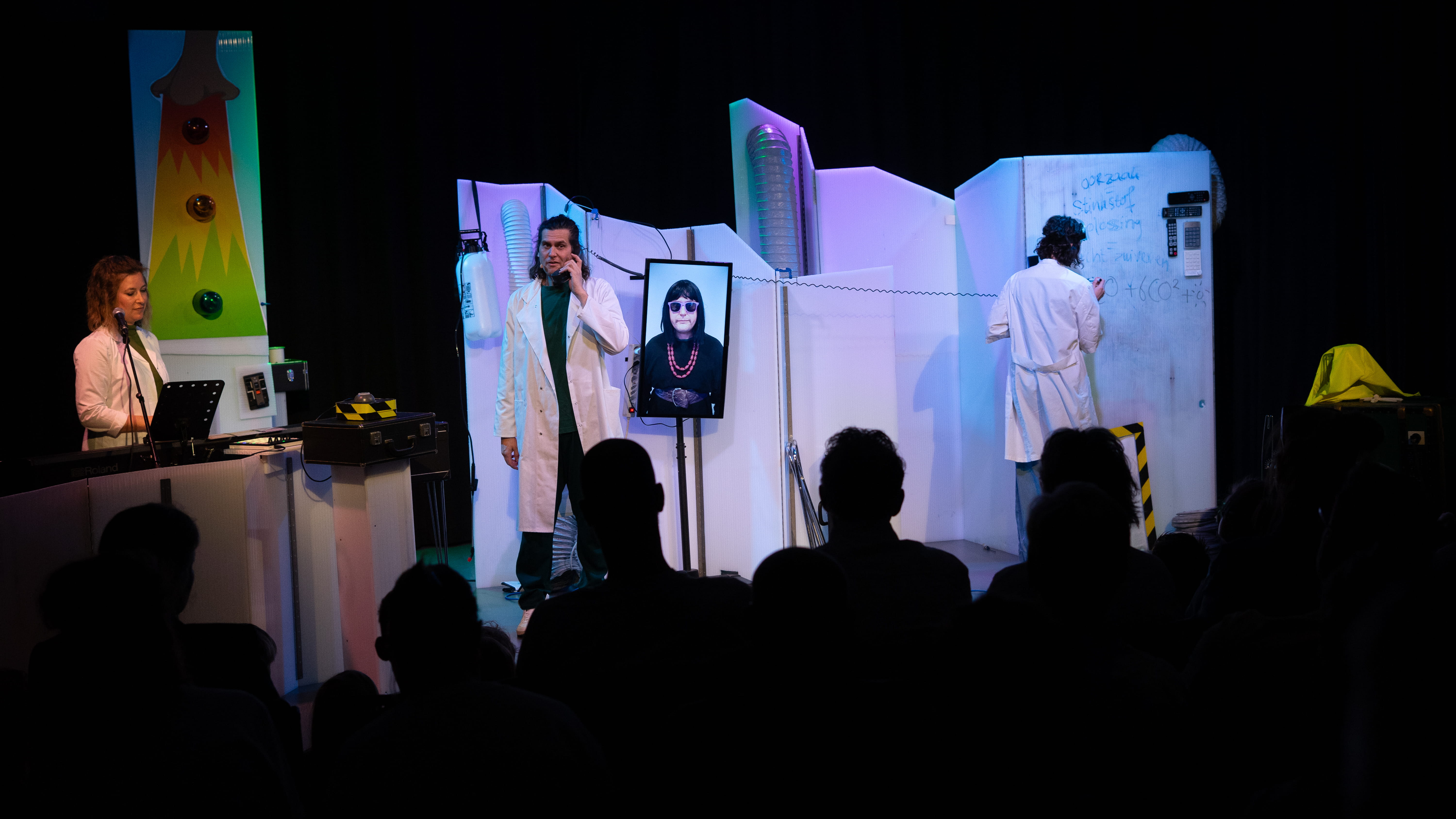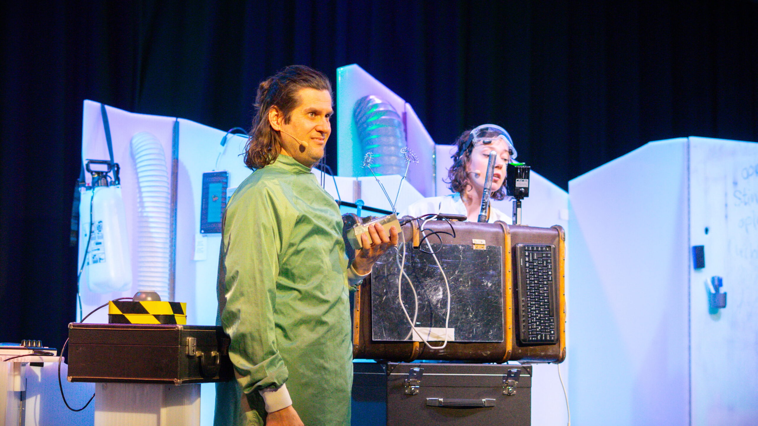Er was namelijk een groot probleem. De hele stad stonk enorm! Gelukkig worden er in het laboratorium allerlei bijzondere uitvindingen gedaan in de hoop dat de stank minder zou worden. Met hier en daar wat hulp van de kinderen in de zaal kwam het uiteindelijk toch allemaal goed!