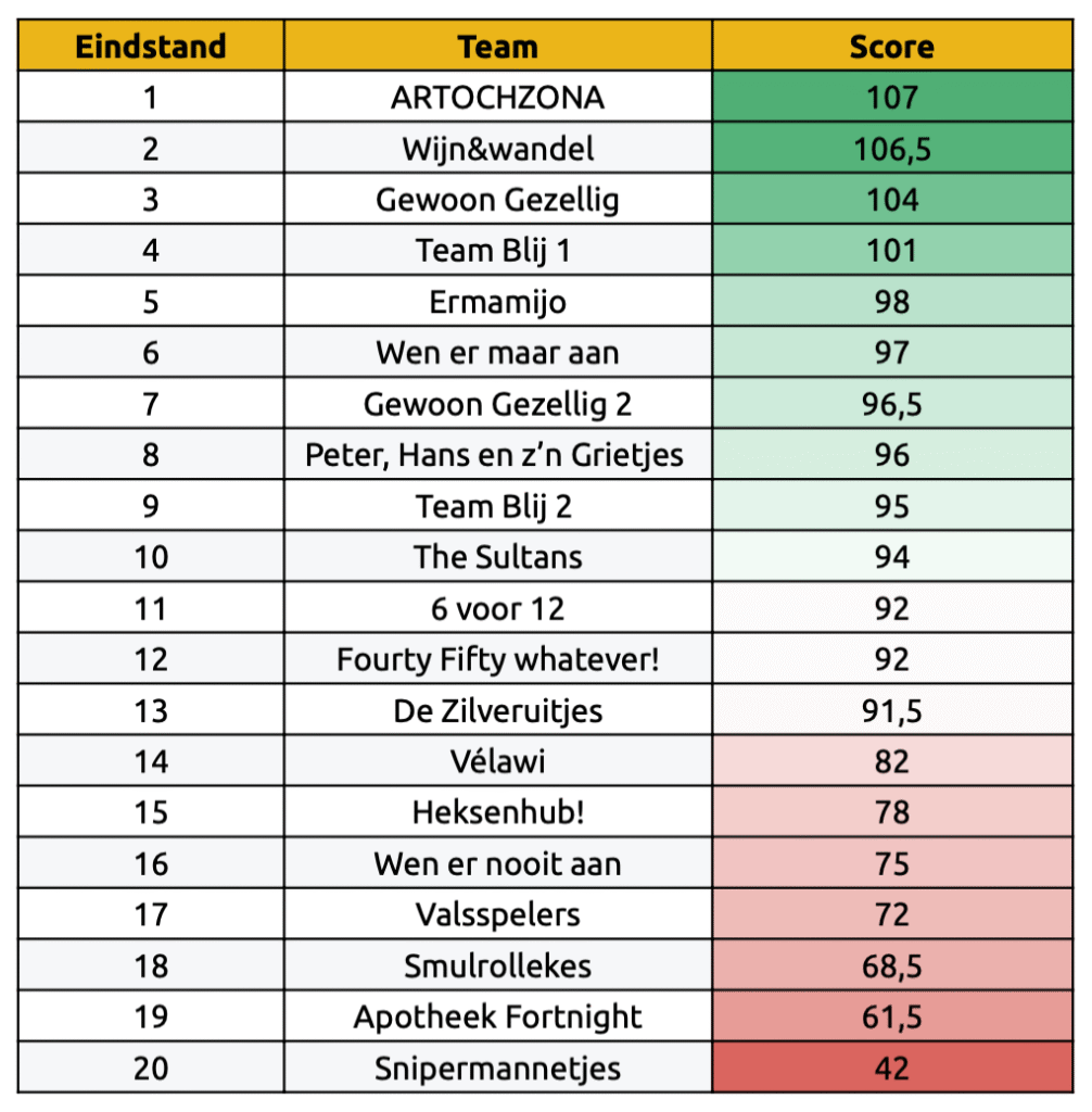 Het werd een bloedstollend spannende editie. Na het nakijken van alle antwoorden bleek dat er tussen de derde en de eerste plaats slechts drie punten verschil zat. Team Gewoon Gezellig pakte voor de derde keer op rij een podiumplek, dit keer met de derde plaats. Wijn & Wandel eindigde als tweede. En met slechts een halve punt voorsprong completeerde Artozona (ARTOCHZONA) de trilogie: drie overwinningen op rij.